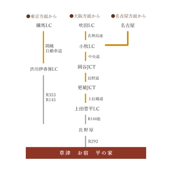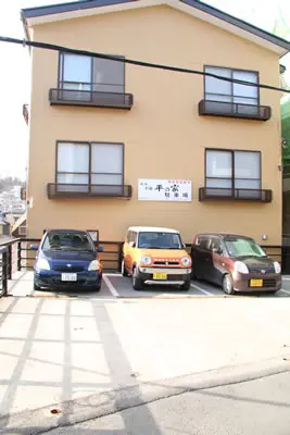 バスターミナル前信号を湯畑方面へ下ります。 『本家ちちや』さん、『佳乃や』さんがある交差点を 湯畑方面へ直進し、すぐの右側にある駐車場へ入り、 突っ切りながら直進していただきますと 左手に平の家駐車場の表記がございます。 当館裏手になります。 道が細いので、運転にはお気をつけください。